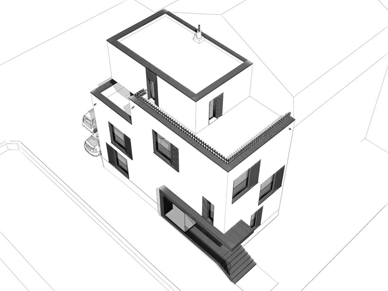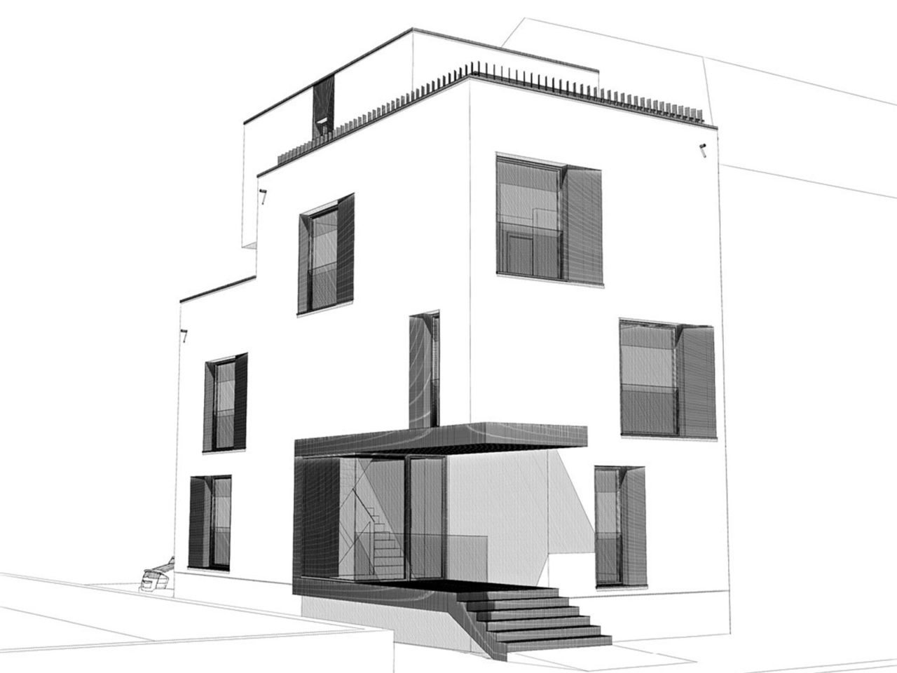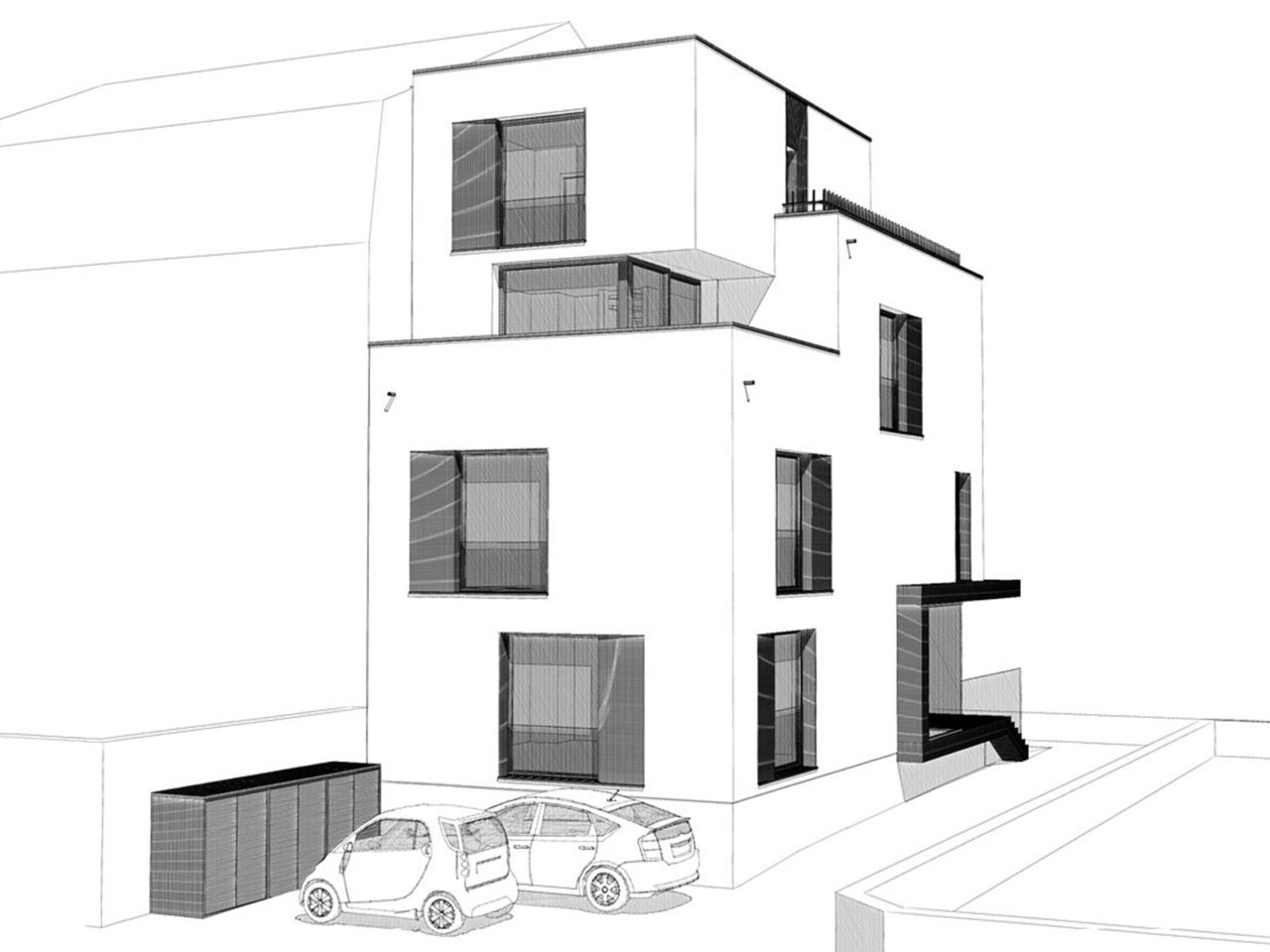 Au cœur du quartier résidentiel de Bonnevoie à Luxembourg, l’immeuble à appartements est adossé à son voisin et se présente en front de rue, en première position par rapport à une construction existante située en fond de cour. Il partage un chemin d’accès et une petite cour avec ce dernier. Le gabarit de l’immeuble s’intègre harmonieusement au caractère urbain du quartier, tandis que son architecture contemporaine marque sa singularité. L’entrée métallique creusée dans le volume et les châssis en biais soulignent les percées dans le volume plein. Les toits sont aménagés en terrasses généreuses desquelles s’extrudent les volumes du dernier étage en retrait.