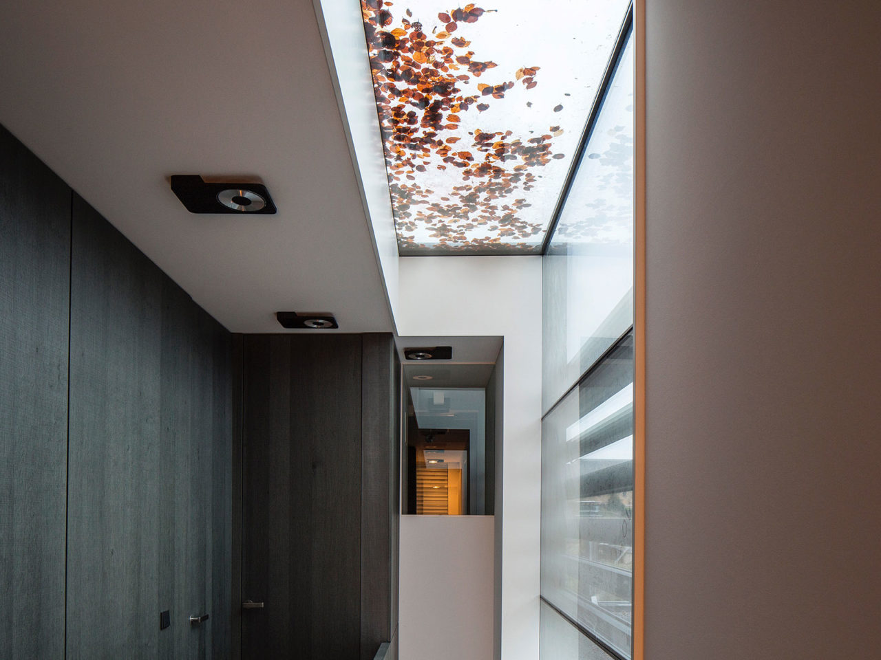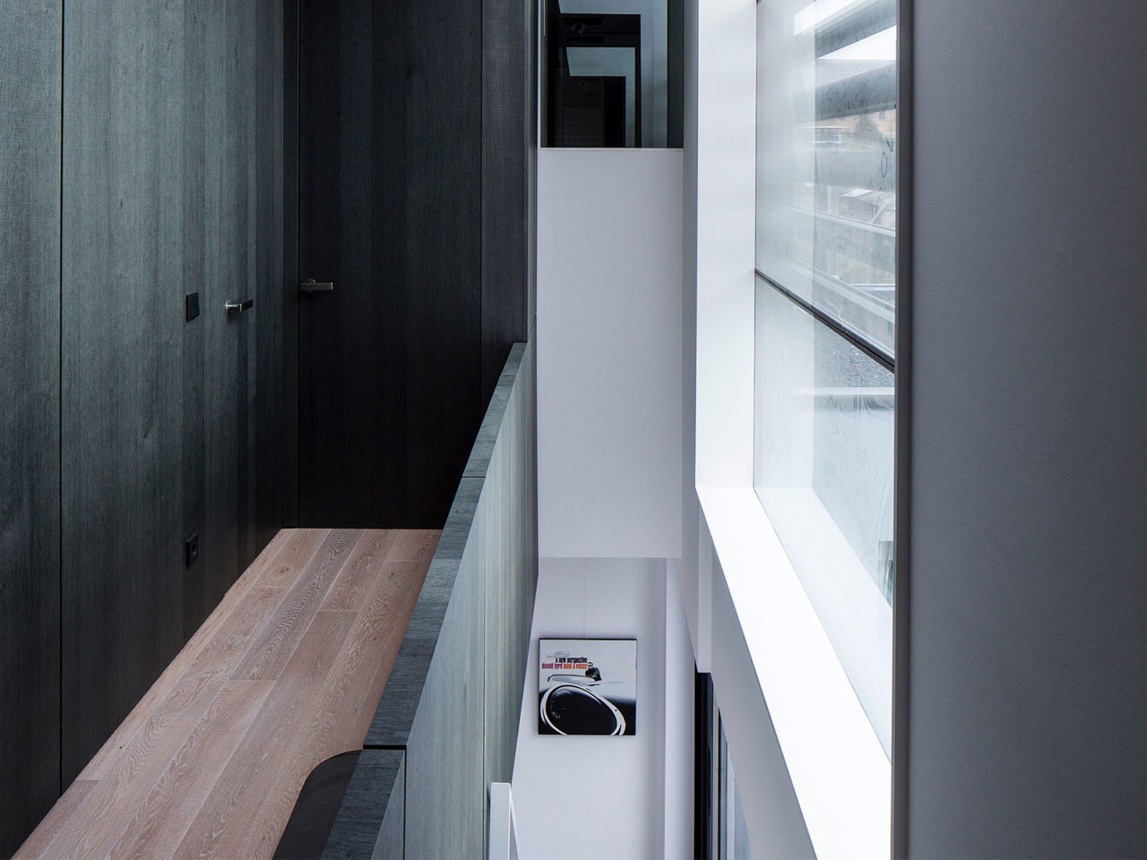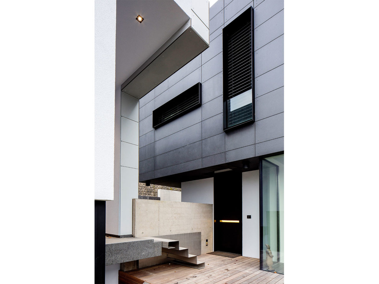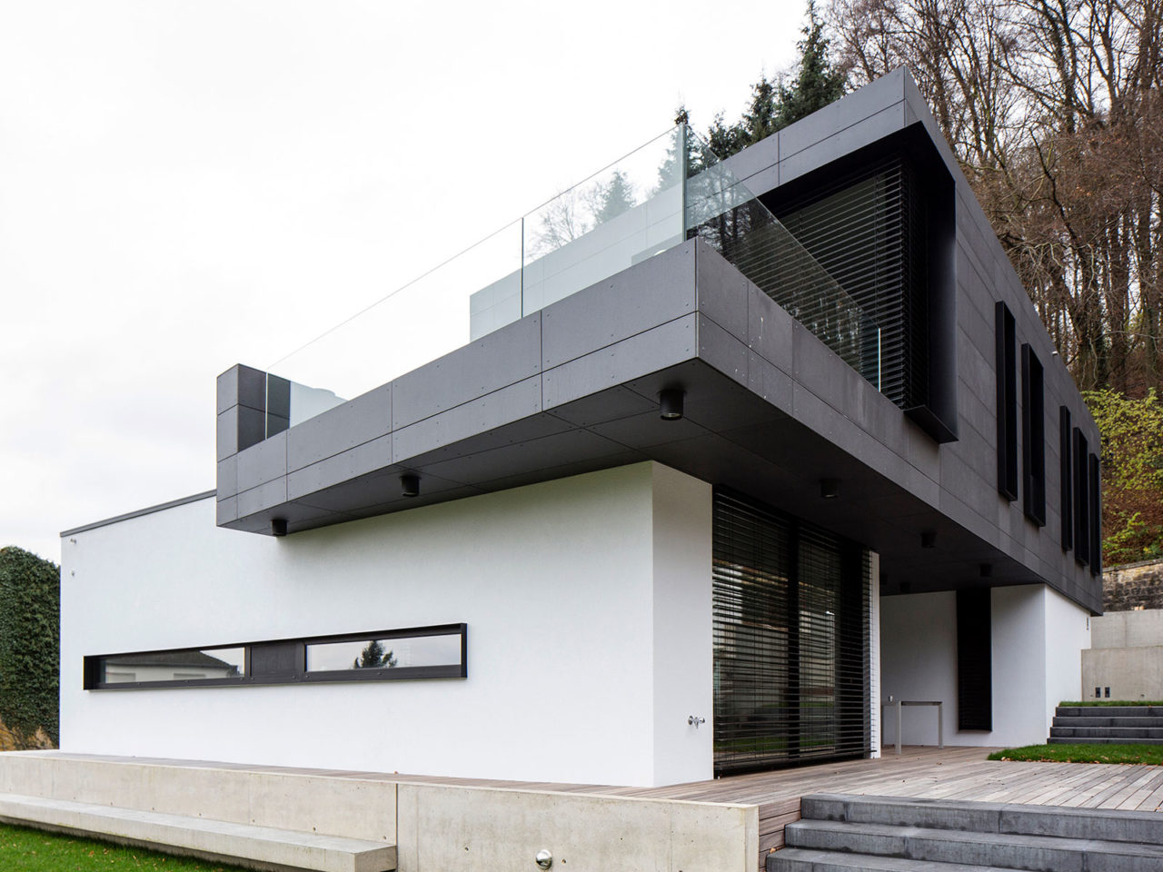 Construite sur un sous-sol enterré en béton et maçonnerie, les quatre volumes visibles constituant l’essentiel de la maison se composent de structures portantes verticales et horizontales en bois. Les façades respectives sont revêtues soit à l’aide d’un isolant enduit de teinte blanche soit de panneaux en béton de teinte noire. De nombreuses ouvertures vitrées placées en fonction de l’orientation du soleil composent ces volumes.