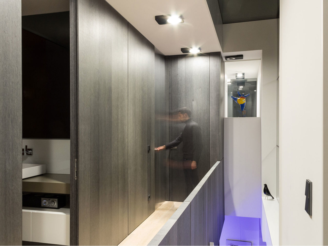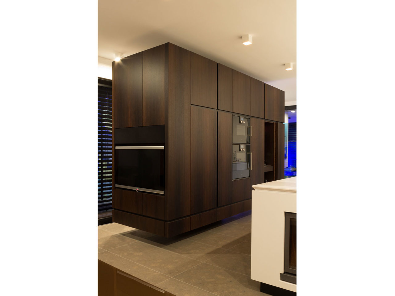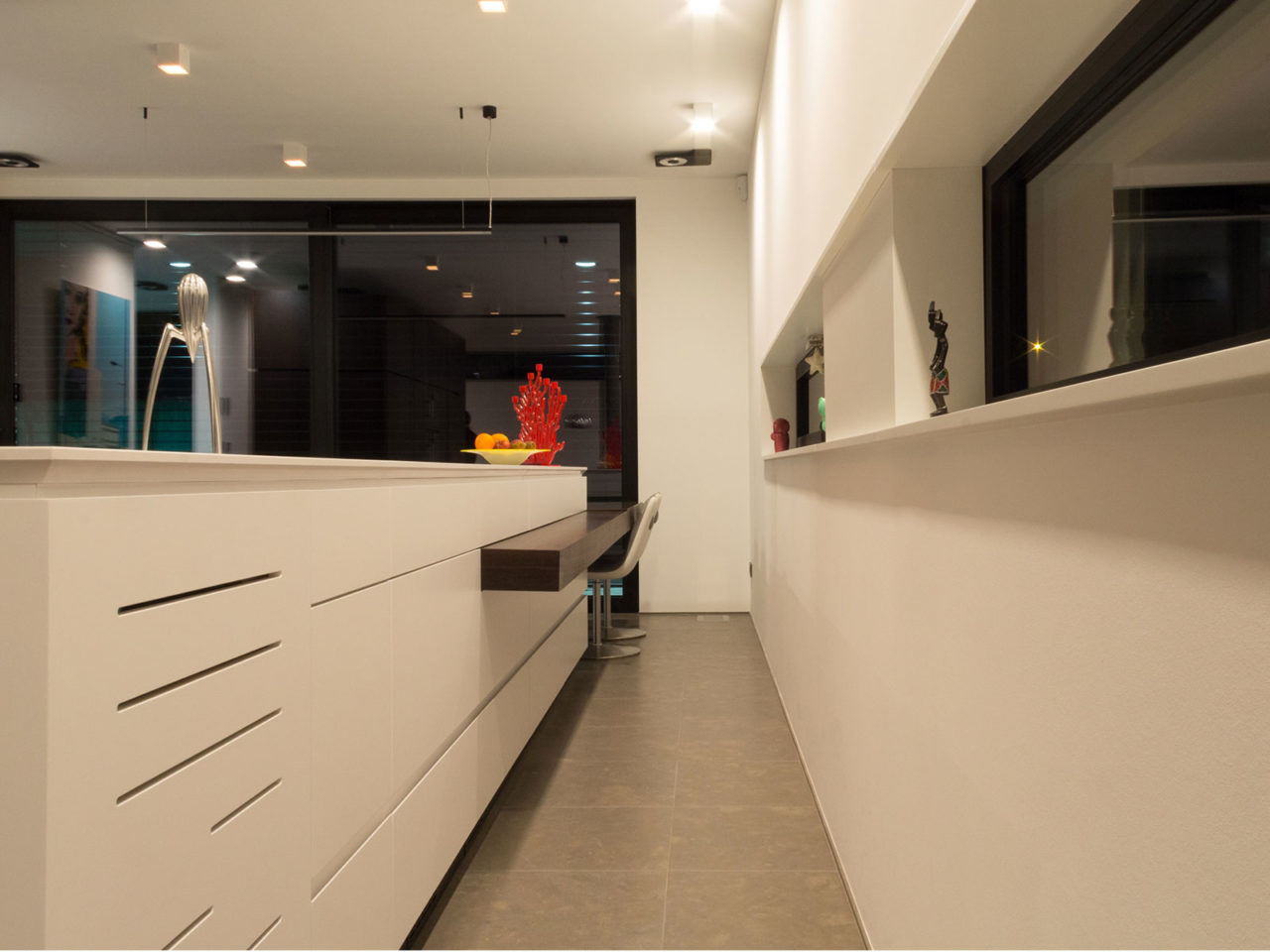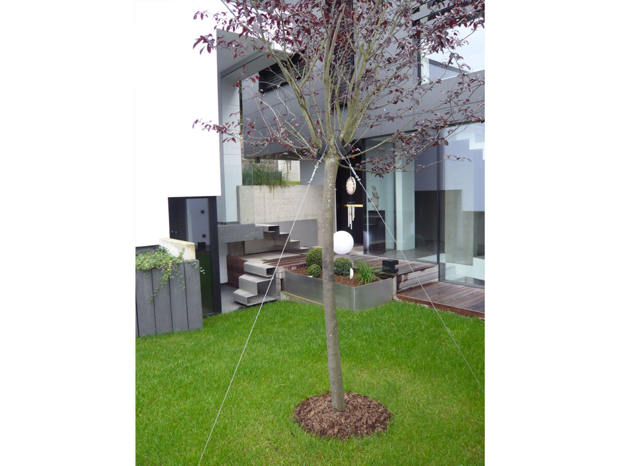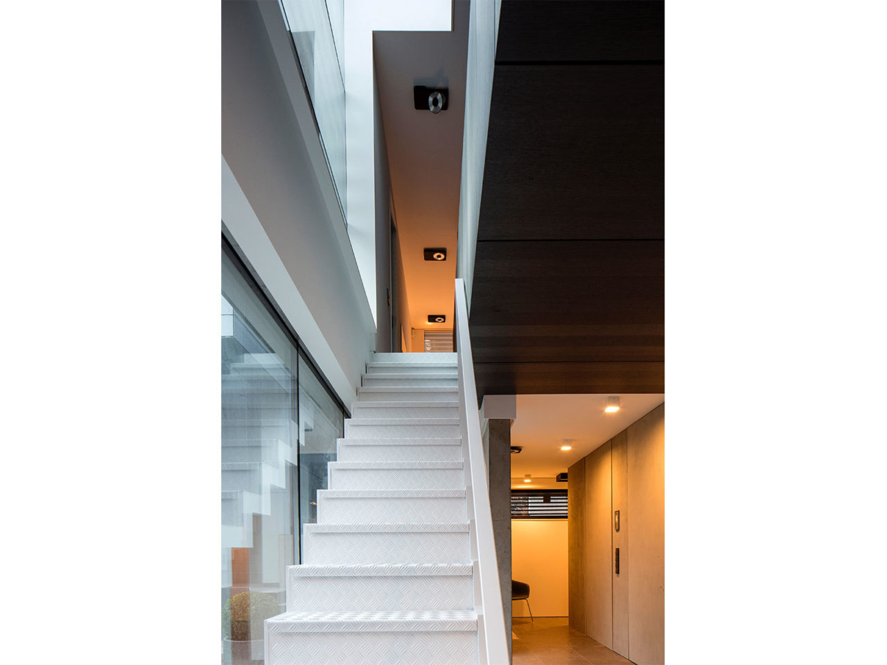 Construite sur un sous-sol enterré en béton et maçonnerie, les quatre volumes visibles constituant l’essentiel de la maison se composent de structures portantes verticales et horizontales en bois. Les façades respectives sont revêtues soit à l’aide d’un isolant enduit de teinte blanche soit de panneaux en béton de teinte noire. De nombreuses ouvertures vitrées placées en fonction de l’orientation du soleil composent ces volumes.