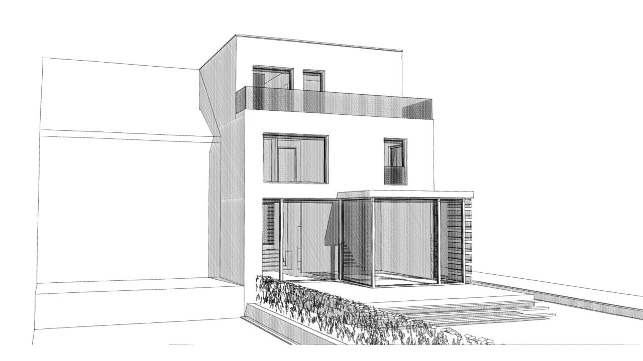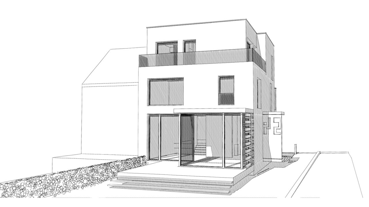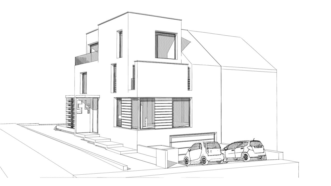 La densification du tissu urbain environnant et les exigences du maître de l’ouvrage ont été les moteurs de conception pour le projet en question. Restreinte par sa surface d’implantation au sol et adossée en mitoyenneté à une maison existante construite en bande, la maison unifamiliale s’est naturellement développée en verticalité, respectant la volumétrie dictée par l’environnement direct. Pensée en demi-niveaux, la structure de la maison permet un juste équilibre entre les différents accès de la maison, à savoir le garage, l’entrée principale et la terrasse jardin. En accord avec les aspirations du maître de l’ouvrage, les espaces et différents niveaux ont été optimisés au maximum, distribuant les fonctions de bas en haut selon un ordre logique. Le positionnement adéquat d’une cage d’ascenseur prévoit l’accès aisé aux différents espaces de la maison sur le long terme. Juste milieu entre un esprit contemporain et un souci de modération en extérieur, la maison unifamiliale surprend par sa capacité intérieure ; l’agencement de chaque demi-niveau est pensé sous forme de cellule de vie, modulé par les fonctionnalités qui l’occupent telles que manger, se détendre et se reposer.